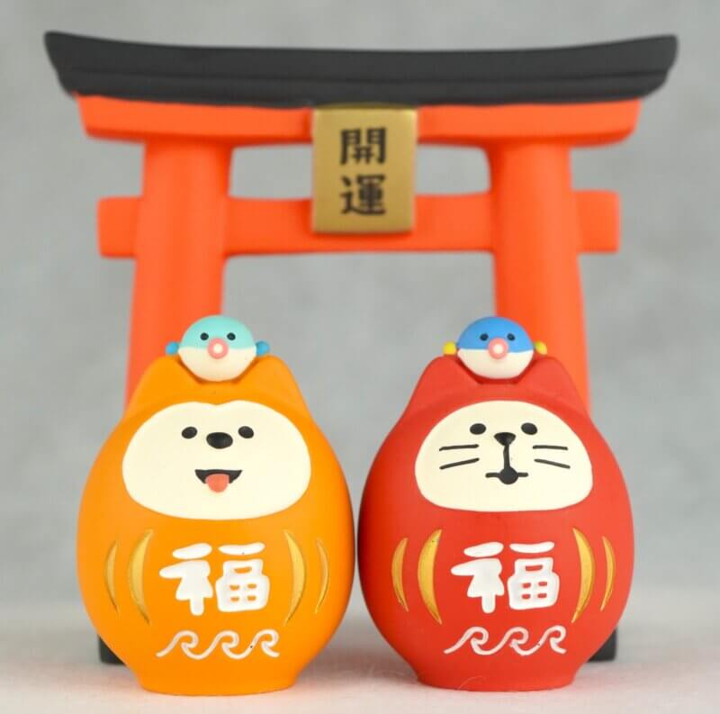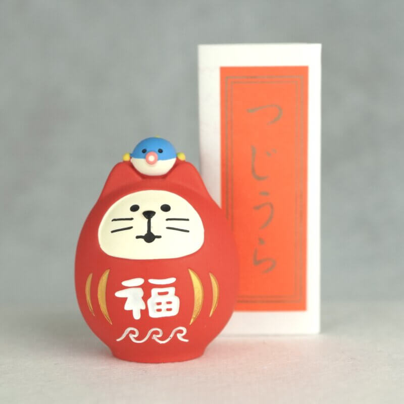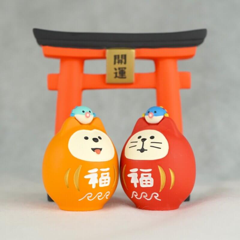 その「ふく」と、まったり・ほっこりした世界観で人気のミニチュアシリーズ「コンコンブル(concombre)」がコラボして生まれたのが、「福猫だるま」と「福柴だるま」です。