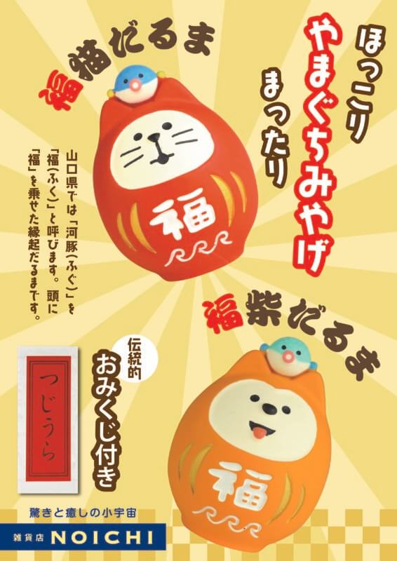 「福猫だるま」「福柴だるま」は、山口県内で雑貨店NOICHIが手がけるオリジナルアイテムとして展開されます。NOICHIは、山口県周南市・山口市・宇部市に店舗を構え、5,000点以上の個性豊かな雑貨を揃えるお店として、地元の方にも観光客にも親しまれています。